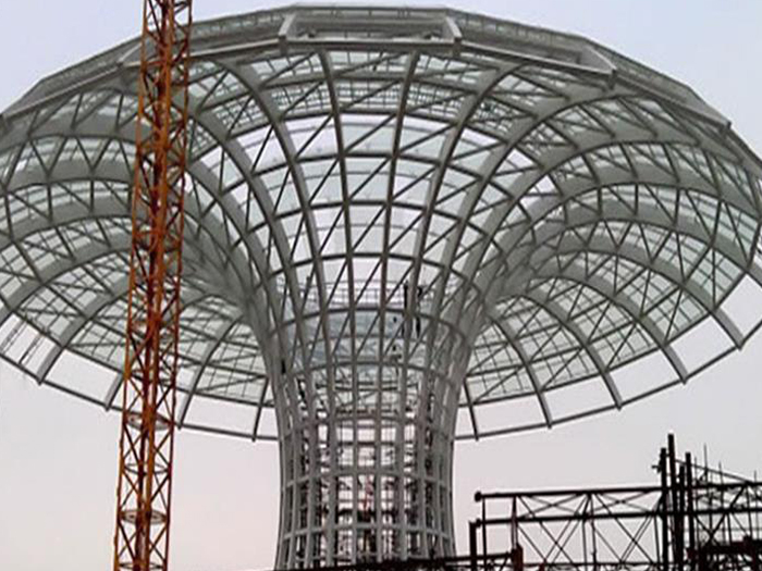 二、球形网架结构因其结构新颖,受力合理,自重轻、用钢量低等优点。如大型体育场馆球形吕梁螺栓球网架、公共场馆球形网架、电厂吕梁螺栓球网架、水泥工业球形网架、仓储物流球形网架、吕梁干煤棚工业球形网架、吕梁收费站吕梁加油站球形网架、展览中心、影剧院、商场、航站楼、候车厅、工厂吕梁车间、仓库、电视塔等球形螺栓球节点网架。国内球形网架结构主要分为:吕梁焊接球节点网架及螺栓球节点网架两种。螺栓球节点网架其构件工厂内加工量较大,现场安装便捷,适用于现场工期紧,吕梁施工条件、用电量受制约,网架形状复杂、吕梁杆件定位困难的异形结构。螺栓球节点球形网架系统基本由吕梁杆件、螺栓球、支撑支座等组成。按照节点形式可分为交叉吕梁桁架体系、四角锥体系、三角锥体系等。支撑方式多为固定支座支撑。对于大面积、大跨度及有特殊受力或伸缩要求的网架结构可采用橡胶支座、滑移支座、球铰支座等支撑形式,以满足结构自身的受力稳定、均衡,便于内力释放等设计要求。